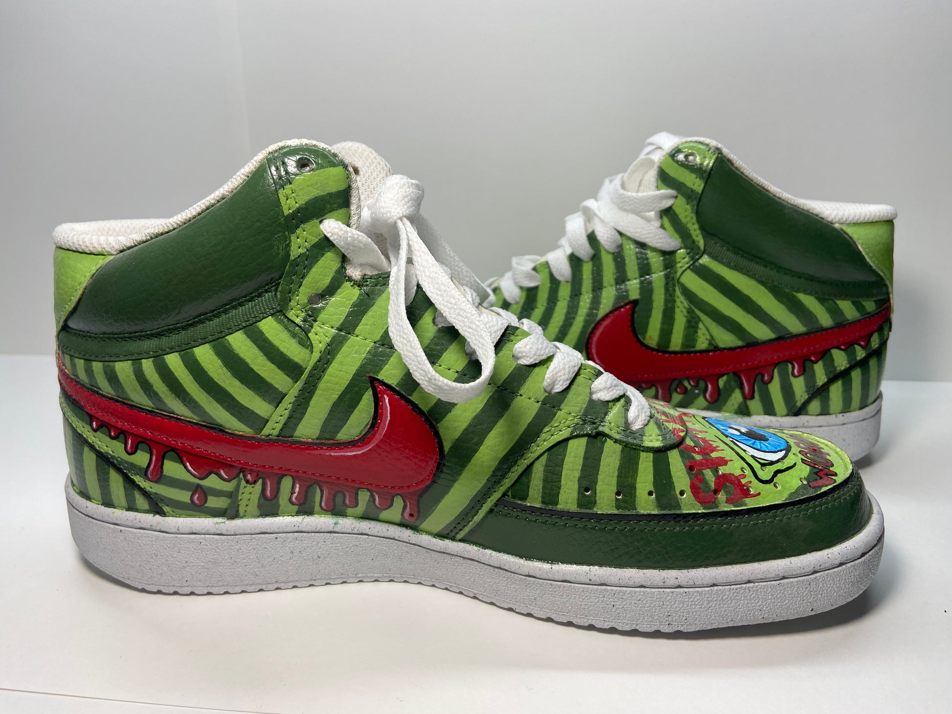 Step into bold, one-of-a-kind style with these custom-painted Nike Air Force 1s. Inspired by the iconic “Sick, Sad World” motif, these shoes feature vibrant green striping with striking hand-painted graphics on the toes: a wide, all-seeing eye with the phrase Sick Sad World in blood-red lettering.