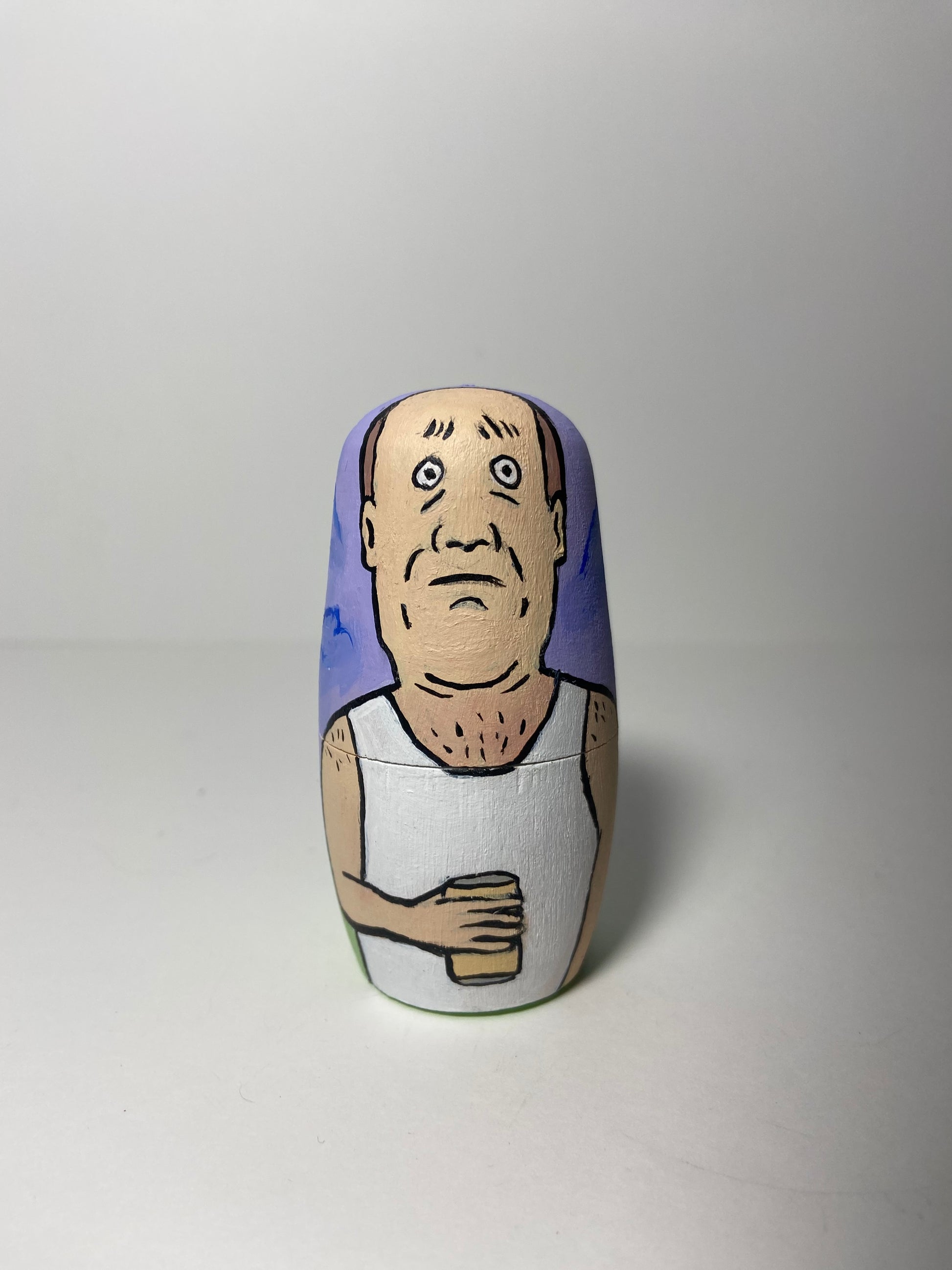 Celebrate the humor and charm of classic animated satire with this one-of-a-kind set of hand-painted wooden nesting dolls. Inspired by a group of beer-loving neighbors and their small-town antics, each doll has been carefully painted by hand with acrylics and sealed for durability, capturing the distinct personalities and quirks of the crew.